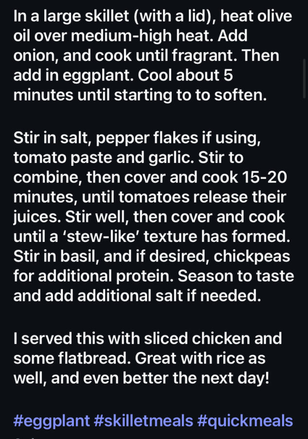 Eggplant Summer Skillet Post author:Adam Batson Post published:August 28, 2025 Post category:RECIPES Tags: basil, eggplant, onion, tomato Read more articles Previous PostPesto Grilled Chicken with Cherry Tomatoes Pesto Next PostEggplant Fries You Might Also Like Zucchini Fritters June 23, 2024 Delicata Squash September 19, 2023 Tian Provencal September 18, 2020