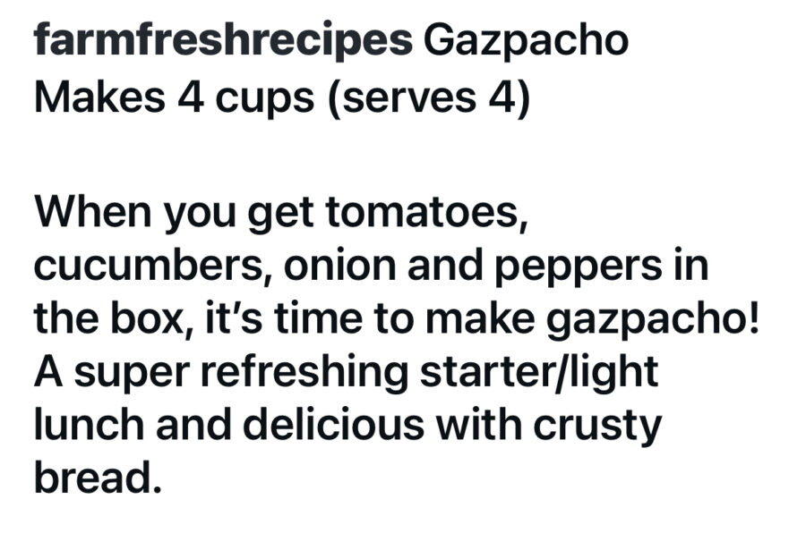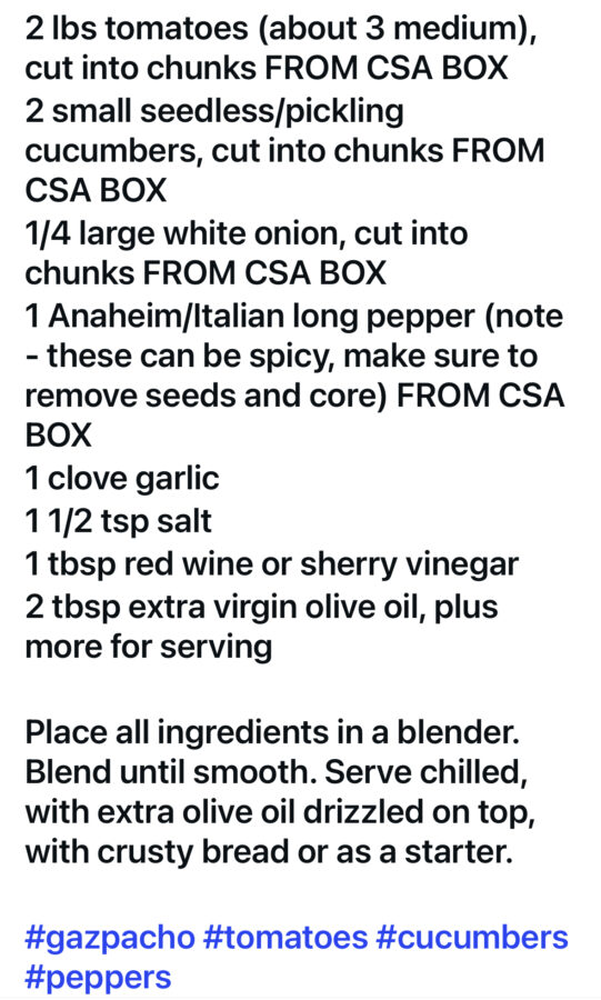Gazpacho Post author:Adam Batson Post published:October 31, 2025 Post category:RECIPES Tags: cucumbers, onions, peppers, tomato Read more articles Previous PostEggplant Summer Skillet You Might Also Like NAPA Cabbage Salad June 5, 2023 How to July 15th 2014 box July 21, 2014 Kale and Cherry Tomato Pasta Salad October 11, 2022