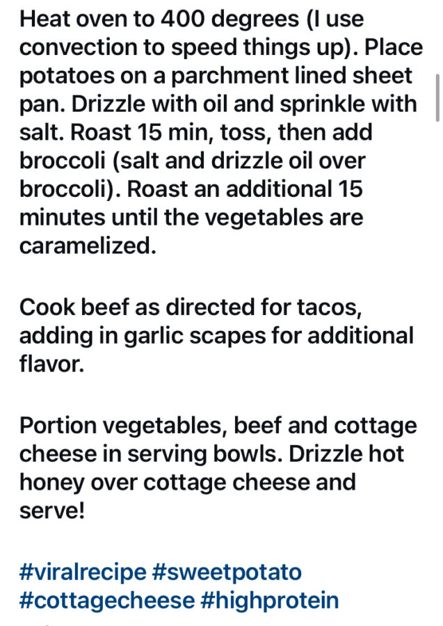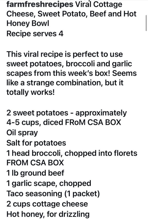 Viral Cottage Cheese, Sweet Potato, Beef and Hot Honey Bowl Post author:Adam Batson Post published:June 17, 2025 Post category:RECIPES Tags: broccoli, garlic scapes, scapes, sweet potato Read more articles Previous PostNapa Cabbage Salad with Sesame Ginger Dressing Next PostGreek Chicken Veggie and Rice Bake You Might Also Like Roasted Pumpkin Seeds October 29, 2019 Farm Fresh Minestrone December 27, 2023 Saag Paneer (Indian Spinach and Cheese Dish) June 10, 2023