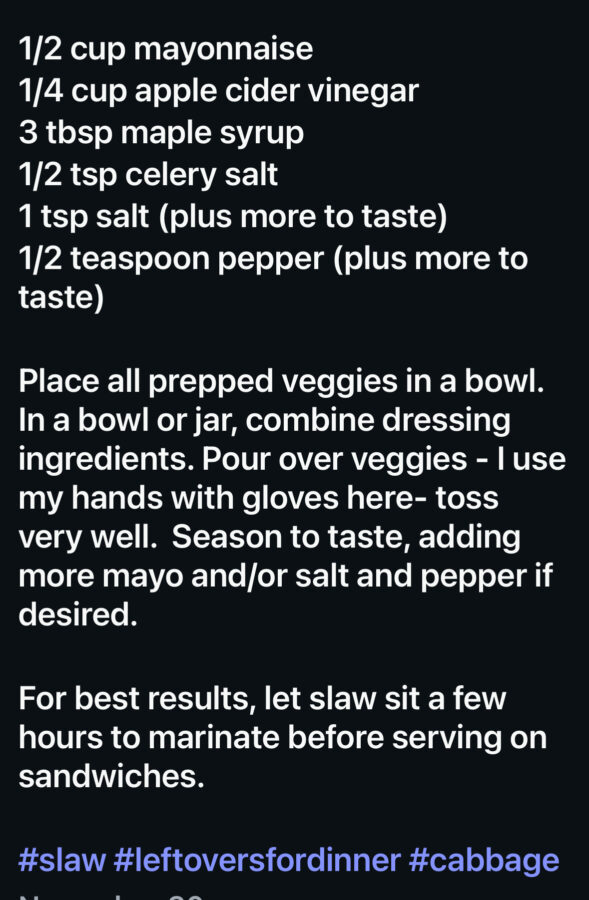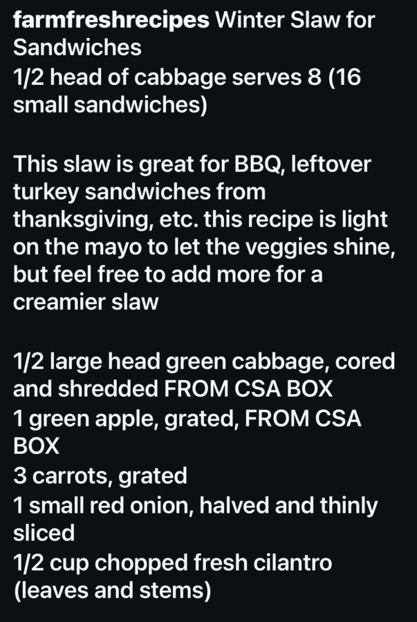 Winter Slaw for Sandwiches Post author:Adam Batson Post published:December 29, 2025 Post category:RECIPES Tags: apple, cabbage, carrots, cilantro, onion Read more articles Previous PostHarvest Sheet Pan Supper with Maple Miso Mustard drizzle You Might Also Like CSA Pasta Salad October 11, 2022 Patty pan squash and tomatoes smoothie July 15, 2013 New Year’s Lentil and Greens Soup with Butternut Squash January 3, 2025