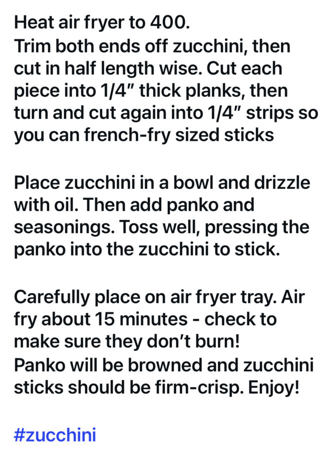 Zucchini ‘Fries’ Post author:Adam Batson Post published:October 31, 2025 Post category:RECIPES Tags: zucchini Read more articles Previous PostZucchini Meatballs You Might Also Like Baked Pasta with Fresh Vegetables & Cheese October 3, 2014 Winter Farm Fresh Bowl February 1, 2025 SweetPotato/Yam Pie December 29, 2022