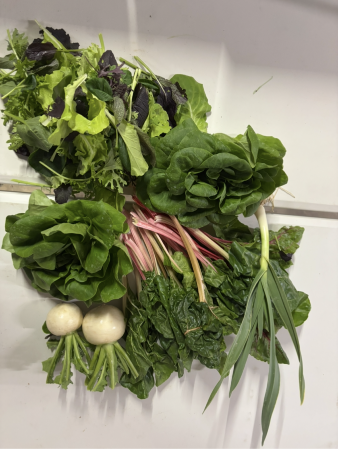 2 heads baby (or 1 bigger) lettuce, hakurei turnips, mixed greens, chard, green garlic